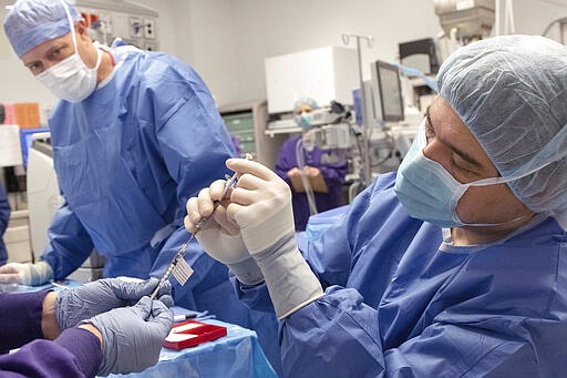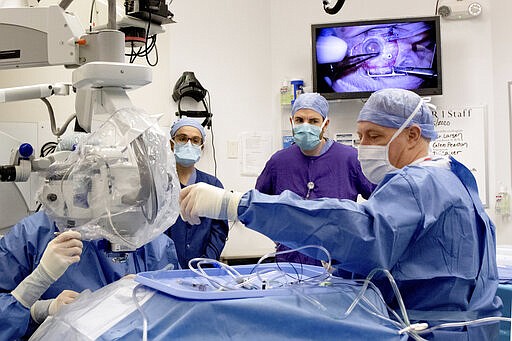 In this undated photo provided by the Oregon Health & Science University on Wednesday, March 4, 2020, Dr. Andreas Lauer, right, prepares to perform the first-ever in vivo CRISPR gene edit procedure for the BRILLIANCE clinical trial at the school's Casey Eye Institute in Portland, on a patient who had an inherited form of blindness. It may take up to a month to see if it worked to restore vision. (Kristyna Wentz-Graff/OHSU via AP)