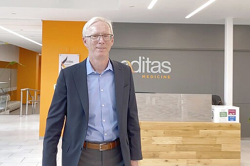 Charles Albright, executive vice president and chief scientific officer at Editas Medicine, a genome-editing company, in Cambridge, Mass., walks through the company's office on Jan. 8, 2020. “We literally have the potential to take people who are essentially blind and make them see,” said Albright, whose company is developing a gene editing treatment for blindness with Dublin-based Allergan. “We think it could open up a whole new set of medicines to go in and change your DNA." (AP Photo/Rodrique Ngowi)