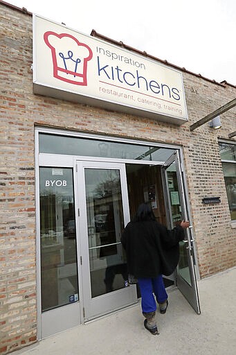 In this Jan. 29, 2020, photo, a customer walks in to Inspiration Kitchens in Chicago. From Hawaii to Pennsylvania, states are scrambling to blunt the impact, with roughly 700,000 people at risk of losing benefits unless they meet certain work, training or school requirements. Inspiration Corporation, a nonprofit, runs the training kitchen and restaurant out of a converted Chicago warehouse. (AP Photo/Nam Y. Huh)