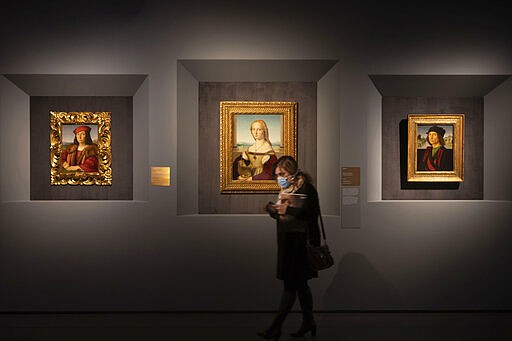 A woman wearing a mask walks past, from left, Raphael's portrait of a Young Man with an Apple, Young Woman with Unicorn and Portrait of a Man, at a press preview of Raphael's exhibition in Rome, Wednesday, March 4, 2020. The paintings, drawings and sketches in the most ambitious assemblage ever of Raphael works in an exhibition, more than even the Renaissance superstar had in his workshop at one time, are collectively insured for 4 billion euros ($.4 billion), against the likes of theft or vandalism. But no money can guarantee that Italy’s outbreak of coronavirus, the largest in Europe, won’t play havoc with the three-month run in Rome of the art world’s eagerly-awaited blockbuster. (AP Photo/Domenico Stinellis)