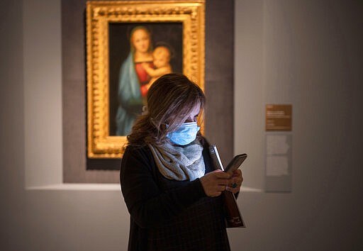 A woman wearing a mask attends a press preview of Raphael's exhibition in Rome, Wednesday, March 4, 2020. The paintings, drawings and sketches in the most ambitious assemblage ever of Raphael works in an exhibition, more than even the Renaissance superstar had in his workshop at one time, are collectively insured for 4 billion euros ($.4 billion), against the likes of theft or vandalism. But no money can guarantee that Italy’s outbreak of coronavirus, the largest in Europe, won’t play havoc with the three-month run in Rome of the art world’s eagerly-awaited blockbuster. (AP Photo/Domenico Stinellis)