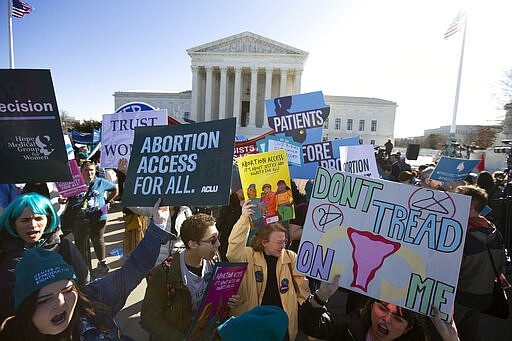Abortion rights demonstrators rally outside of the U.S. Supreme Court in Washington, Wednesday, March 4, 2020. The Supreme Court is taking up the first major abortion case of the Trump era Wednesday, an election-year look at a Louisiana dispute that could reveal how willing the more conservative court is to roll back abortion rights. (AP Photo/Jose Luis Magana)