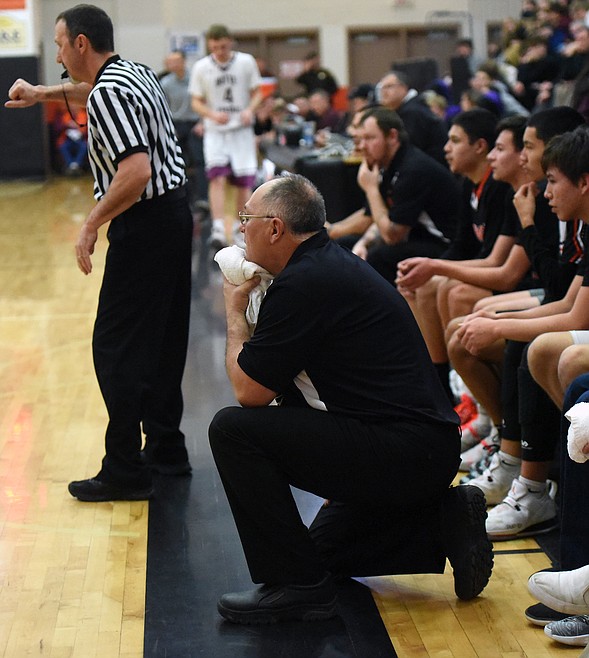 Ronan coach Ron Couture watches from the sidelines as the Chiefs played Butte Central in the first round of the Western A Divisional Tournament Feb 27. This was Couture’s first year as the Ronan Chiefs head coach. (Whitney England/Lake County Leader)
