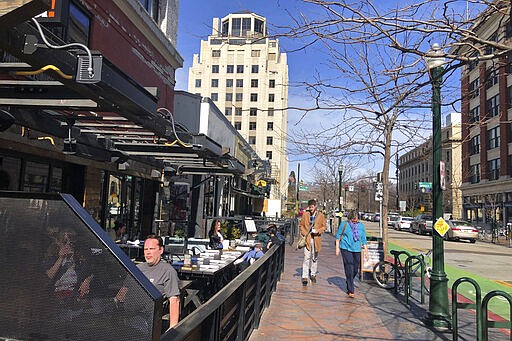 In this Wednesday, March 4, 2020, photo, pedestrians and diners enjoy sunny weather in Boise, Idaho. Idaho's presidential primary on Tuesday could give an indication of the political leanings of all the newcomers to the state. The deeply conservative state last year was the fastest-growing in the nation, increasing by 2.1% with nearly 37,000 new residents and approaching 1.8 million. In the last decade, according to the U.S. Census Bureau, Idaho has seen a population jump of more than 200,000. (AP Photo/Keith Ridler)