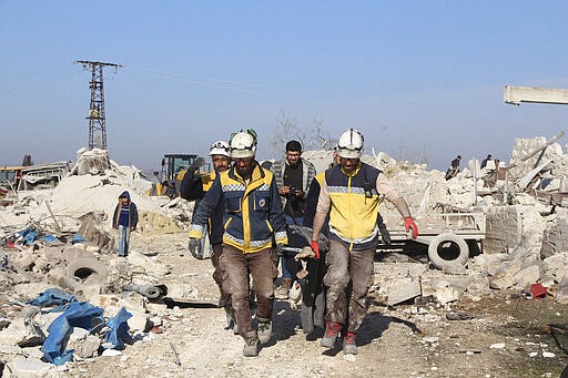 In this photo provided by the Syrian Civil Defense White Helmets, which has been authenticated based on its contents and other AP reporting, Syrian White Helmet civil defense workers carry a victim next of destroyed houses hit by Russian airstrikes, in Maaret Musreen village, in Idlib province, Syria, Thursday, March 5, 2020. An airstrike on a rebel-held village in northwestern Syria early Thursday. (Syrian Civil Defense White Helmets via AP)