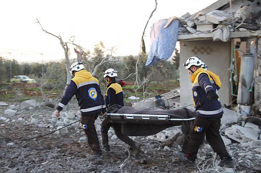 In this photo provided by the Syrian Civil Defense White Helmets, which has been authenticated based on its contents and other AP reporting, Syrian White Helmet civil defense workers carry a victim next to a destroyed house that was hit by Russian airstrikes, in Maaret Musreen village, in Idlib province, Syria, Thursday, March 5, 2020. An airstrike on a rebel-held village in northwestern Syria early Thursday. (Syrian Civil Defense White Helmets via AP)