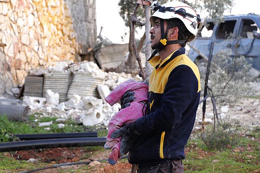 This photo provided by the Syrian Civil Defense White Helmets, which has been authenticated based on its contents and other AP reporting, a Syrian White Helmet civil defense worker carries a child victim after Russian airstrikes hit Maaret Musreen village, in Idlib province, Syria, Thursday, March 5, 2020. An airstrike on a rebel-held village in northwestern Syria early Thursday. (Syrian Civil Defense White Helmets via AP)