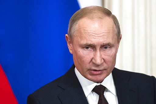 Russian President Vladimir Putin speaks during a joint news conference with Turkish President Recep Tayyip Erdogan after their talks in the Kremlin, in Moscow, Russia, Thursday, March 5, 2020. Russian President Vladimir Putin and his Turkish counterpart, Recep Tayyip Erdogan, say they have reached agreements that could end fighting in northwestern Syria. (AP Photo/Pavel Golovkin, Pool)