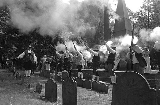 A wreath was laid at the grave of the five victims of the fateful conflict, and colonial re-enactors fired their muskets in salute during a morning tribute organized by the Daughters of the American Revolution.