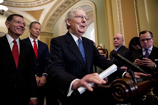 Senate Majority Leader Mitch McConnell of Ky., center, accompanied by Sen. John Barrasso, R-Wyo., left, and Senate Majority Whip Sen. John Thune, R-S.D., second from left, speaks at a news conference after meeting with Vice President Mike Pence, the head of President Donald Trump's coronavirus task force, on Capitol Hill, Tuesday, March 3, 2020, in Washington. (AP Photo/Andrew Harnik)