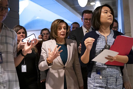 Speaker of the House Nancy Pelosi, D-Calif., arrives to meet with Vice President Mike Pence and the White House coronavirus task force leaders, on Capitol Hill in Washington, Wednesday, March 4, 2020. (AP Photo/J. Scott Applewhite)