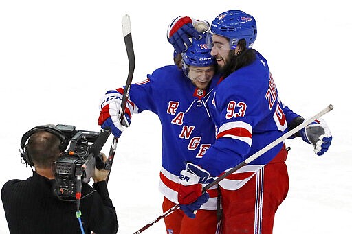 The Rangers broke a 3-3 tie early in the third period. Pavel Buchnevich had the puck behind the net and connected with Zibanejad, who was cutting across the net just 12 seconds in.