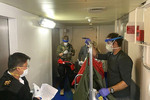 The ship was heading from Hawaii to San Francisco when it was ordered Wednesday to keep its distance from shore so 46 people with possible coronavirus symptoms could be tested. On Thursday, a military helicopter crew lowered test kits onto the 951-foot (290-meter) ship by rope and later flew them for analysis at a state lab.