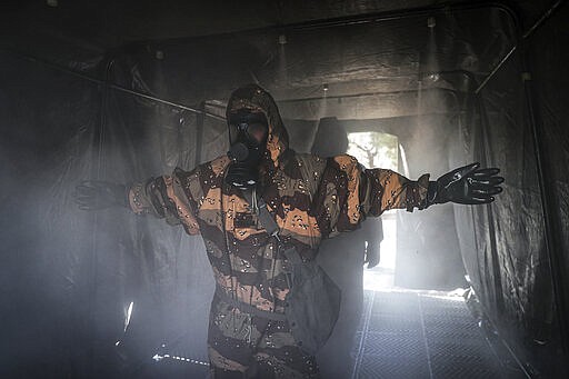 Wearing gas masks and suits designed to protect during chemical weapons attacks, Guard members have been seen washing down areas to kill lingering traces of the virus that causes the COVID-19 illness. They've touted operations to target those hoarding desperately needed medical supplies.