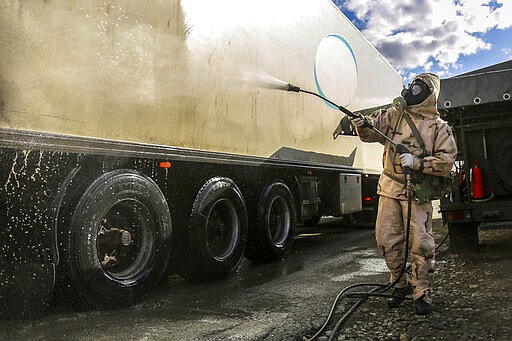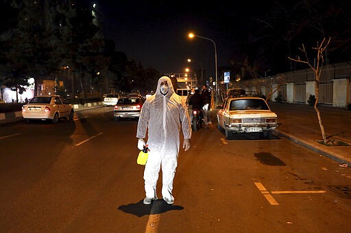 DUBAI, United Arab Emirates (AP) — Wearing gas masks and waterproof fatigues, members of Iran's Revolutionary Guard now spray down streets and hospitals with disinfectants as the Islamic Republic faces one of the world's worst outbreaks of the new coronavirus.