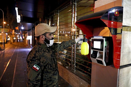 In this Wednesday, March. 4, 2020 photo, a Revolutionary Guard member disinfects an ATM machine to help prevent the spread of the new coronavirus in Tehran, Iran. Wearing gas masks and waterproof fatigues, members of Iran's Revolutionary Guard now spray down streets and hospitals with disinfectants as the Islamic Republic faces one of the world's worst outbreaks of the new coronavirus. (AP Photo/Ebrahim Noroozi)