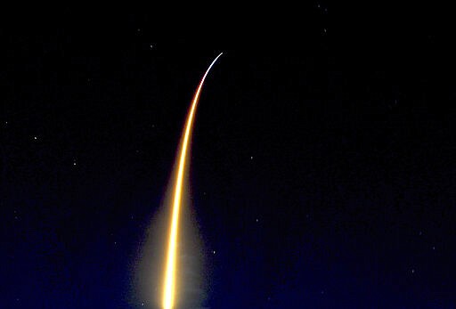 In a time exposure, a SpaceX Falcon is launched from Cape Canaveral, Fla., as seen from Viera, Fla., Friday night, March 6, 2020. The Falcon rocket blasted off with 4,300 pounds (1,950 kilograms) of equipment and experiments for the International Space Station. Just minutes later, the spent first-stage booster made a dramatic midnight landing back at Cape Canaveral, its return accompanied by sonic booms. (Tim Shortt/Florida Today via AP)