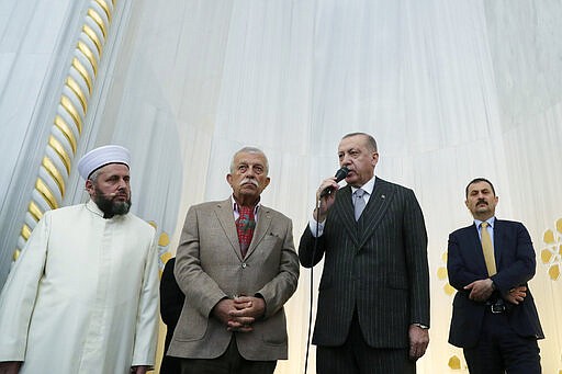 Turkey's President Recep Tayyip Erdogan speaks to people after Friday prayers inside Buyuk Camlica Mosque, in Istanbul, Friday, March 6, 2020. Russian President Vladimir Putin and Erdogan said late Thursday in Moscow, they have reached agreements that could end fighting in northwestern Syria. (Presidential Press Service via AP, Pool)