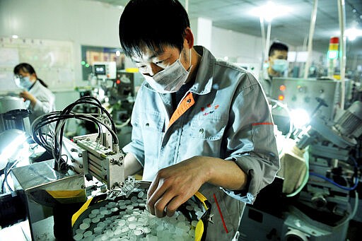 FILE - In this Feb. 23, 2020, file photo, workers make optical lenses in a factory in Dexing city in central China's Jiangxi province. China’s exports fell by double digits in January and February as anti-virus controls closed factories, while imports sank by a smaller margin. (Chinatopix Via AP, File)