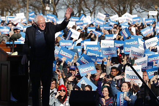 Supporters of Democratic presidential candidate Sen. Bernie Sanders, I-Vt., wave their campaign signs at a rally in Chicago's Grant Park Saturday, March 7, 2020. (AP Photo/Charles Rex Arbogast)