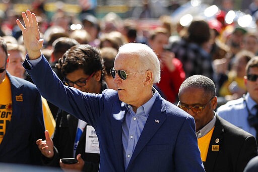 Democratic presidential candidate former Vice President Joe Biden waves to supporters after speaking during a campaign rally Saturday, March 7, 2020, in St. Louis. (AP Photo/Jeff Roberson)