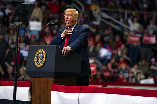 In this Feb. 21, 2020, photo, attendees listen as President Donald Trump speaks during a campaign rally in Las Vegas. The Trump show has a consistent script, with villains, nicknames, grievances and the same hero: himself. At raucous rallies, mostly in states friendly to him, the president tells audiences he could be presidential if he chose to be, even Lincolnesque. (AP Photo/Patrick Semansky)