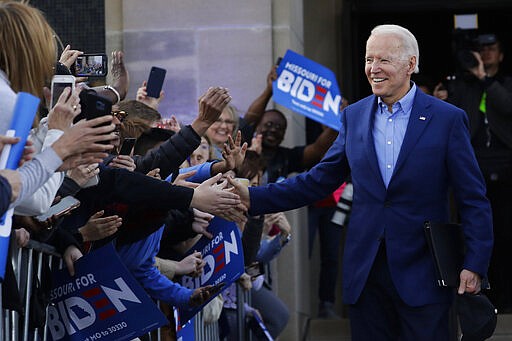 Democratic presidential candidate, former Vice President Joe Biden greets the crowd during a campaign rally Saturday, March 7, 2020, in Kansas City, Mo. (AP Photo/Charlie Riedel)
