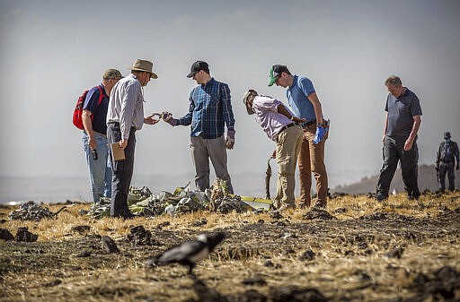 FILE - In this March 11, 2019 file photo, parts of the plane wreckage lie at the scene where the Ethiopian Airlines Boeing 737 Max 8 crashed shortly after takeoff on Sunday killing all 157 on board at the crash site at Bishoftu, or Debre Zeit, outside Addis Ababa, Ethiopia. When air safety investigators release an interim report on the crash of an Ethiopian Airlines Boeing 737 Max sometime before Tuesday, March 10, 2020, the one-year anniversary of the crash, they are likely to place the blame on the jet's automated flight control system as well as on the pilots and their training, but it's unclear yet which side will bear the brunt. (AP Photo/Mulugeta Ayene, File)