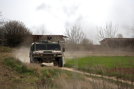 Greek army patrol at the Greek-Turkish border in the village of Kastanies, Evros region on Monday, March 9, 2020. Turkish President Recep Tayyip Erdogan will visit Brussels on Monday for talks with European Union officials amid a standoff between Ankara and Brussels over sharing of responsibility for refugees and migrants. (AP Photo/Giannis Papanikos)