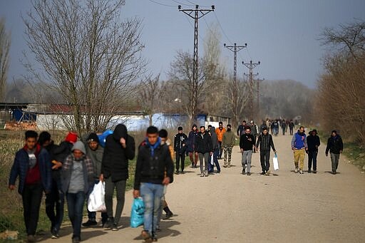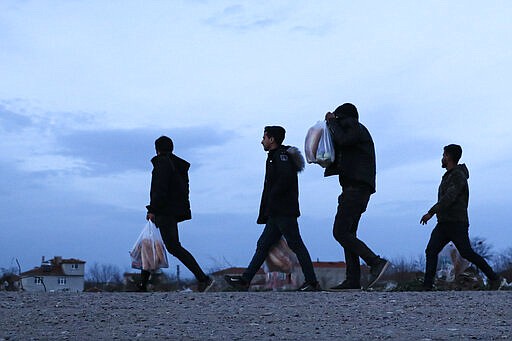 Migrants walk in Edirne at the Turkish-Greek border, Monday, March 9, 2020. Thousands of migrants have massed at Turkey's land border with EU-member Greece after Erdogan's government made good on a long-standing threat and announced that Turkey _ which is home to more than 3.5 million Syrian refugees _ would no longer prevent migrants and refugees from crossing over into EU countries. (AP Photo/Emrah Gurel)