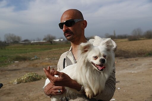 A migrant from Iran carries his dog as he walks near Edirne at the Turkish-Greek border, Monday, March 9, 2020. Thousands of migrants have massed at Turkey's land border with EU-member Greece after Erdogan's government made good on a long-standing threat and announced that Turkey _ which is home to more than 3.5 million Syrian refugees _ would no longer prevent migrants and refugees from crossing over into EU countries. (AP Photo/Darko Bandic)