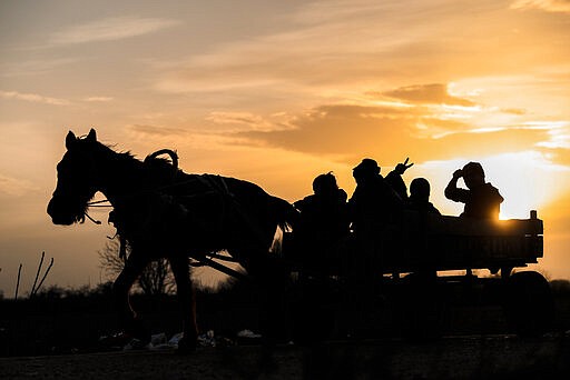 A migrant flashes a victory sign as he rides with others in a cart near the Turkish-Greek border on Sunday, March 8, 2020. Thousands of migrants headed for Turkey's land border with Greece after President Recep Tayyip Erdogan's government said last week that it would no longer prevent migrants and refugees from crossing over to European Union territory. (AP Photo/Darko Bandic)
