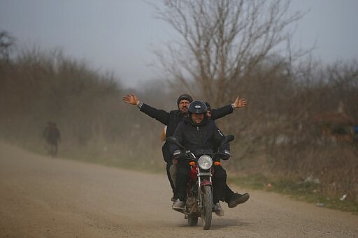 Migrants use a motorbike in Edirne at the Turkish-Greek border, Monday, March 9, 2020. Thousands of migrants have massed at Turkey's land border with EU-member Greece after Erdogan's government made good on a long-standing threat and announced that Turkey _ which is home to more than 3.5 million Syrian refugees _ would no longer prevent migrants and refugees from crossing over into EU countries. (AP Photo/Emrah Gurel)