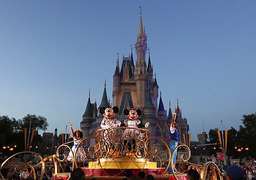 FILE - In this Jan. 15, 2020, file photo, Mickey and Minnie Mouse perform during a parade as they pass by the Cinderella Castle at the Magic Kingdom theme park at Walt Disney World in Lake Buena Vista, Fla. Florida tourism officials say cases of the new coronavirus are having little visible impact on the state's biggest industry so far. Disney officials said in a statement that extra hand sanitizers were being placed throughout its four parks and more than two dozen hotels. (AP Photo/John Raoux, File)