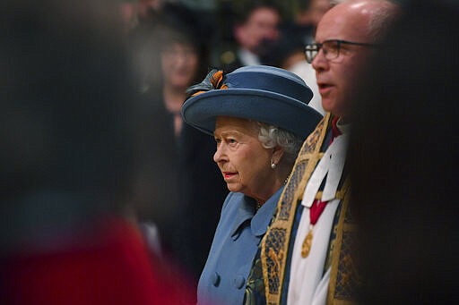 Britain's Queen Elizabeth II and The Very Reverend Dr David Hoyle, Dean of Westminster, right, attend the annual Commonwealth Service at Westminster Abbey in London Monday March 9, 2020. Britain's Queen Elizabeth II and other members of the royal family along with various government leaders and guests are attending the annual Commonwealth Day service, the largest annual inter-faith gathering in the United Kingdom.(Ben Stansall / Pool via AP)