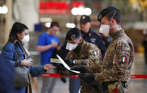 For travelers and commuters, procedures at Milan's main train station were tightened significantly. Police officers in masks backed by pairs of masked armed soldiers checked tickets and documents of people arriving and departing.