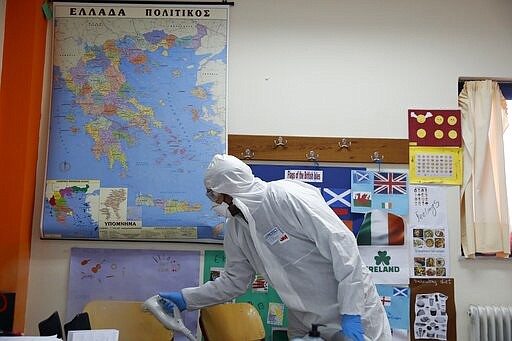 A worker wearing protective suit sprays disinfectant inside a classroom at a primary school in Athens, Monday, March 9, 2020. (AP Photo/Thanassis Stavrakis)