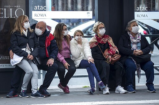 People wait at a bus stop, in Rome, Monday, March 9, 2020. Italy announced a sweeping quarantine early Sunday for its northern regions, igniting travel chaos as it restricted the movements of a quarter of its population in a bid to halt the new coronavirus' relentless march across Europe. (Roberto Monaldo/LaPresse via AP)