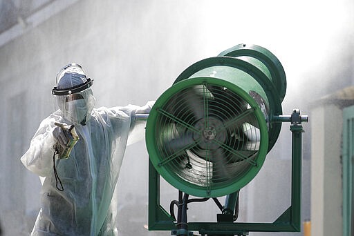 A worker in protective suit controls a large disinfectant spray machine as they sanitize a school that has suspended classes as a precautionary measure against the coronavirus in San Juan city in Manila, Philippines on Monday, March 9, 2020. Philippine President Rodrigo Duterte has declared a state of public health emergency throughout the country after health officials confirmed over the weekend the first local transmission of the new coronavirus. (AP Photo/Aaron Favila)
