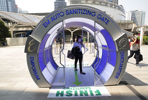 Peoples walk through a 'Auto Sanitizing Gate' in hopes to avoid the spread of the coronavirus outside a shopping mall in Bangkok, Thailand, Monday, March 9, 2020. (AP Photo/Sakchai Lalit)