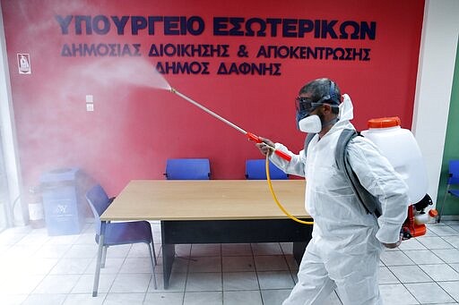 A worker wearing a protective suit sprays disinfectant inside a citizen's service office in the Athens' eastern suburb of Dafni, Monday, March 9, 2020. The sign reads "Interior Ministry. Municipality of Dafni." (AP Photo/Thanassis Stavrakis)