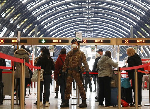 Police officers and soldiers check passengers leaving from Milan main train station, Italy, Monday, March 9, 2020. Italy took a page from China's playbook Sunday, attempting to lock down 16 million people — more than a quarter of its population — for nearly a month to halt the relentless march of the new coronavirus across Europe. Italian Premier Giuseppe Conte signed a quarantine decree early Sunday for the country's prosperous north. Areas under lockdown include Milan, Italy's financial hub and the main city in Lombardy, and Venice, the main city in the neighboring Veneto region. (AP Photo/Antonio Calanni)