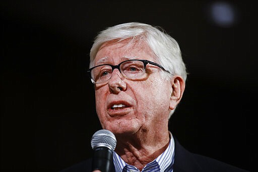 FILE - In this Jan. 27, 2020, file photo, Iowa attorney general Tom Miller introduces Democratic presidential candidate former Vice President Joe Biden at a campaign event in Iowa City, Iowa. Vaping giant Juul Labs has donated thousands of dollars to court state attorneys general. But the lobbying strategy may be backfiring. (AP Photo/Matt Rourke, File)
