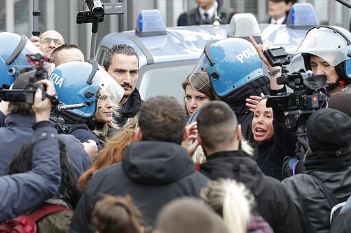 At Rome's other prison, Rebibbia, relatives of inmates were joined by prisoner advocates who draped a banner across a police barricade reading “Free them all."
