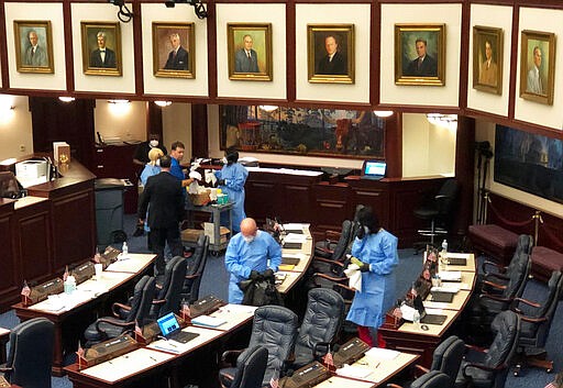 The public gallery overlooking the chamber floor also was evacuated as a small crew dressed in blue medical gowns swabbed down desks in the chamber. The recess halted legislative business in the House and Senate for more than an hour.