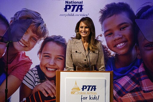 ALEXANDRIA, Va. (AP) — Melania Trump urged parents and teachers Tuesday to teach children how to interact in positive ways and also to prepare them for the negativity that comes with living in a digital age, calling them the “front line” against irresponsible behavior online.