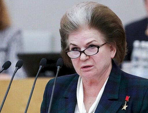 In this handout photo provided by The State Duma, The Federal Assembly of The Russian Federation, the world's first woman cosmonaut Valentina Tereshkova speaks during a session prior to voting for constitutional amendments at the State Duma, the Lower House of the Russian Parliament in Moscow, Russia, Tuesday, March 10, 2020. Tereshkova, the first woman to have flown in space and a lawmaker with Russia's ruling party, proposed Tuesday to scrap presidential term limits in order to allow Russia President Vladimir Putin to run for re-election in 2024. (The State Duma, The Federal Assembly of The Russian Federation via AP)