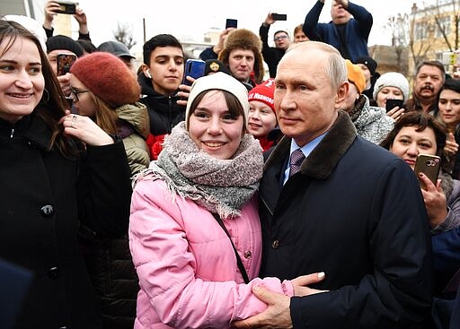 Russian President Vladimir Putin, center, right, poses for a picture with people in Ivanovo, 254 kilometers (158 miles) northeast of Moscow, Russia, Friday, March 6, 2020. Russian President Vladimir Putin said Friday he doesn't want to scrap presidential term limits or resort to other suggested ways of extending his rule, but otherwise he kept mum about his plans. (Alexei Nikolsky, Sputnik, Kremlin Pool Photo via AP)