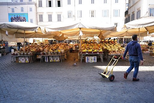 A man pulls a trolley at an emtpy Campo dei Fiori open-air market, in Rome, Tuesday, March 10, 2020. The Italian government is assuring its citizens that supermarkets will remain open and stocked after panic buying erupted after broad anti-virus measures were announced nationwide, sparking overnight runs on 24-hour markets. (AP Photo/Andrew Medichini)