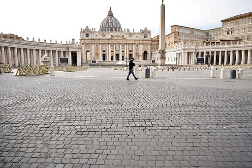 An Italian police officer walks in an empty St. Peter's Square after the Vatican erected a new barricade at the edge of the square, in Rome, Tuesday, March 10, 2020. Italy entered its first day under a nationwide lockdown after a government decree extended restrictions on movement from the hard-hit north to the rest of the country to prevent the spreading of coronavirus. (AP Photo/Andrew Medichini)